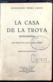Alejandro Pérez Lugín (1870–1926) was a Spanish writer and film director. He attended university in Santiago de Compostela, and a number of his books have Galician themes. His 1921 novel Currito of the Cross, which uses bullfighting as its backdrop, has been adapted into film four times.[1] Pérez Lugin himself directed successful film adaptations of two of his works during the silent era.