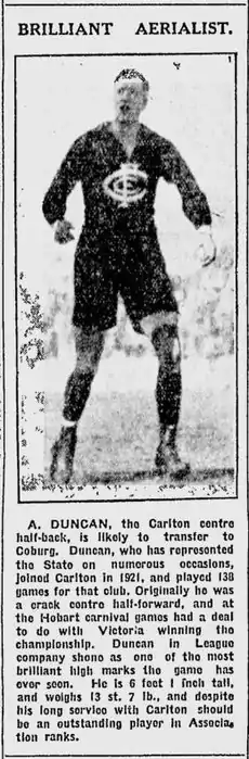 - ↑ Brownlow Medal: Won by S. Coventry, The Argus, (15 September 1927), p. 5. In the only match that Carlton played against Collingwood that year (round nine), Duncan was far, far better than anyone else on the ground, including Coventry (it was "Duncan's match").