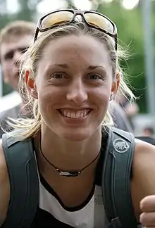 Alexandra Johnson (born April 3, 1989) is an American rock climber who specializes in bouldering and who has made numerous first female ascents of notable boulders, including Clear Blue Skies V12 (8A+) in Colorado, and Book of Nightmares V12 (8A+) and Lethal Design V12 (8A+) in Red Rocks. Her highest rated boulder send, as of 2022, was The Swarm at grade V14 (8B+) in Bishop.[1] In competition bouldering, she won the overall American Bouldering Series in 2009, and has twice won individual stages in the annual IFSC Climbing World Cup series in bouldering.[2]