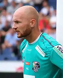 In the 2016–17 season he started the season as the first goalkeeper, but as in the previous season, he lost his place to Dobnik, who replaced him after the ninth matchday.[11] Shortly before the winter break, however, Kofler was able to replace him again. At the end of the season, he also served as captain for the club for the first time. In the 2016–17 season, as in the previous season, he made 25 Bundesliga appearances.[1] In the 2017–18 season, he was demoted to the backup towards the end of the by interim head coach Robert Ibertsberger, and from the 30th matchday Dobnik and Marko Soldo were given priority. Under new head coach Christian Ilzer, Kofler became the undisputed starter, and kept that position throughout the 2018–19 season.[1] With Wolfsberger AC, he also qualified for the group stage of the UEFA Europa League, finishing third in the league.[12] In the Europa League, he also played in all six group matches the following season. Finishing last in Group J, however, the Carinthians were eliminated in the group stage.[13] In the league, Kofler was still the starter in the 2019–20 season.[1]