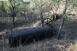 The battery plant includes a Cornish boiler in a brick mount with a flue leading to an intact nine metre high metal chimney. Immediately alongside the boiler is the body of a single cylinder horizontal engine. Alongside the engine are two mortar boxes which appear to have remained in situ although the stamper frame has been removed. Seven of the ten stamper rods are still standing in the mortar boxes. The camshaft is nearby.[1]