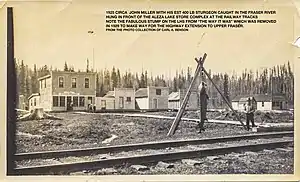 The fertile land favoured ranching in the area,[143] but one settler left farming for mining, when his chickens unearthed a gold nugget.[161] Trapper Matt Hilton (c.1876–1921),[162] who had a cabin about four miles (6.4 km) to the south, succumbed to his poor health and perished outdoors in the extreme winter cold.[163][164] Resident trapper F. Martin (Deafy) Dayton (1886–1940), formerly at Kidd,[165] promoted his big game hunting guide,[166] before returning to Kidd. Prior to Ole Hansen's (1892–1974) move to Hansard, he spent the 1920s at Aleza Lake.[167][168] Local trapper William Youst (1898–1951)[169][170] lived alone in north-central BC from the early 1920s.[171] The area was known for its moonshiners,[119][172] but during the 1930s, Youst's illegal still netted him a $100 fine or three months in jail.[173] Another permanent resident was farmer[174] and trapper John Miller, who operated a laundry during the early 1920s.[175][176] Trapper Johan (John) (Old Caribou) Bergstrom (1890–1969)[177][83] lived alone in a shack just west of the store, which children would frequent after school. At their urging, he would take them swimming or fishing. Parents were appreciative that he not only kept the youngsters safe, but also taught them to swim. When he returned from a winter of trapping, the children would rush to greet him.[178][179]