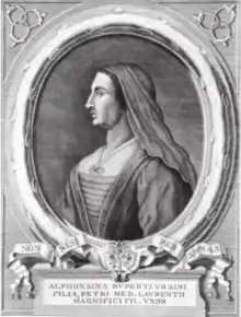 Alfonsina Orsini (1472 – 7 February 1520) was a Regent of Florence. She governed the Republic of Florence during the absences of her son in the period of 1515–1519. Her rule was feared as a sign of the end of republican government there. She was born from a noble family and raised in the royal court of Naples. She was the spouse of Piero di Lorenzo de' Medici from 1488 and the mother of Lorenzo II de' Medici. She helped restore the Medicis to power after they had been exiled. She worked to secure a French royal marriage for her son, and was also influential at the court of Pope Leo X, her brother-in-law.
