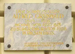 Memorial plaque in Vienna Alsergrund – "The writer Alfred Grünwald lived from 1927 until his emigration in 1938 in this house."