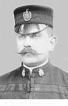 Alfred Richardson duly started his duties at Newcastle-under-Lyme Police Station on 2 September 1901. The Force size for the town was 18 men. His new telephone number was '9'.[13] Within a few days there was a ceremony at the Town Hall and Square for the mayor and the town dignitaries and local citizens to meet their new chief constable, which he attended in his Number One uniform. This showed the chief constable's badge of rank, worn on the epaulettes, which consisted of crossed tipstaves in a wreath, surmounted by a crown, similar to the insignia of a Lieutenant General in the British Army. The population of the town was about 20,000 people and it was heavily industrialized. The conditions[14] for his men were, "All Officers had to wear helmets for all duties and keep Truncheons. Constables would work twelve hours a day, seven days a week. There would be two shifts, one day and one night." There were no meal breaks. A beat system was such that a constable was taken to the start of his beat on foot by a superior. Constables worked on 'shifts', which meant they spent about six or seven hours during the day or night at their work. Some weeks they did 'nights', others they did 'evenings', others did 'days'. At this period they worked seven days a week with no rest days, which was to become a factor in Richardson's next appointment. As he had in Birmingham previously, the new chief constable now appeared by name regularly in the local newspaper in court cases.[15] In these cases Alfred Richardson was the prosecutor, a role he was to continue in his next post. At this time, and later, the Borough had an ongoing problem with smallpox, which added to police work with contagion. Newcastle-under-Lyme Fire Service worked, as all fire services did, in conjunction with the local police force, but it was an entirely separate unit. There was a fire brigade captain and lieutenant, 12 men and two runners in Richardson's time. In 1901 it had a first-class steam engine, one manual engine and a new fire escape. It was separated from the police force in the early 1880s.[16]