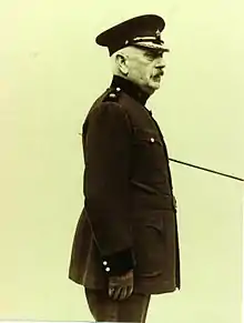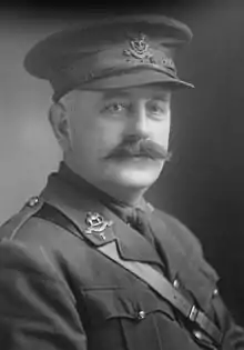 Around about 1910 the Borough Police acquired four police horses. They were purchased and used for crowd control with the horses being stabled in the yard at the Harrison Road Police Station, having their names over their stable doors.[39] Four horses were photographed in the Mounted Police Section in 1930 as part of the annual inspection of the Halifax Borough Police of that year by Sir Llewelyn Atcherley, His Majesty's Inspector of Police,[40] with Chief Constable Richardson.[41] The Suffragettes were holding meetings that often ended with crowd trouble and there were many strikes at local works and on the railways in the offing at Halifax. A year later a car was purchased for Halifax police use and bicycle use had reached a peak by this time. Also, a motorbike and sidecar unit was formed and based at Harrison Road. 1911 saw the first national census when the householder presented the census form as opposed to giving verbal details to an enumerator.[42] On 18 May 1912 there was a special meeting of the Watch Committee and it was resolved 'That the Police Standing Orders be reprinted as amended and re-published to the Force.' This was an update of the booklet published on 7 May 1906 and reflected the improved conditions of the Police Force and reaffirmed that the Force could know the regulations to which it was their duty to conform.[note 5] On 11 July 1912 King George V and Queen Mary visited Clough Mill, a factory site near Halifax. This entailed a heavy police presence and a large amount of police activity to ensure their security. Alfred Richardson was later to become recognised for a particular police security procedure he created for this event which had the security and police activity highly organised.[43] Always involved with Police Pensions, Alfred Richardson added to the Family Archives a newspaper article from Sheffield where a Quarter Sessions Judge gave police officers consideration where the house, free gas and coal were supplied when calculating that officer's pension.[44] At the outbreak of the First World War he joined up as a Territorial, in the Duke of Wellington's Regiment which had a long-standing association with Halifax. He was the assistant provost marshal and given the rank of major.[45] Alfred Richardson was in charge of the Harrow Dog Kennels near Halifax, which provided dogs for the war effort. During the early days of World War I, Chief Constable Alfred Herbert Richardson was in charge of the kennels. They provided dogs for use in the trenches, for scouting with soldiers and for use in sentry duty at isolated posts.[46] In 1914, he served with the 4th Battalion Duke of Wellington's Regiment and as a major was the Halifax recruiting officer with the regiment.[47]