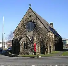 This is a Grade II listed building, designed by Thompson in partnership with Isaac Thomas Shutt (1818–1879).[1] The main structure is built of rusticated gritstone ashlar. The building is constructed parallel to the Otley Road on its south side, so that the plan is not quite east–west. It has a "circular bell tower reminiscent of Irish bell-houses"[1] transepts and an apsoidal chancel. The vestry is in the south transept, and the organ chamber in the north. The east window is in the apse, inside a low gable which runs down from a hipped roof. The lancet windows high in the gables, over the west and transept windows, were probably once for ventilation but are now glazed.[1]