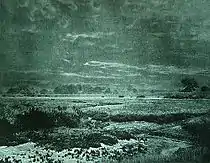 Hinton's photograph, "Requiem," was used as the frontispiece of the first issue of Alfred Stieglitz's magazine, Camera Notes, in 1897.[6] His photograph, "Day's Decline," appeared in Volume 3, Issue 1 of Camera Notes two years later. "Reed Harvesting," was exhibited at the first London Salon in 1894, and his "Salt Marshes" was exhibited at the first Paris Salon that same year.[15] Hinton photographs that garnered considerable attention at the Photographic Salon in subsequent years included "Recessional" (1901), "Weeds and Rushes" (1902), "Fleeting and Far" (1903), and "The White Mill" (1907).[15] In a 1907 issue of The Photographic News, Hinton described "Melton Meadows" as his best photograph.[16]
