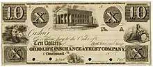 Kelley's close association with the banks made him a leading figure in the Ohio banking community by the mid-1830s.[92] In April 1832, Kelley and eight others sought additional investment to help expand the Commercial Bank of Lake Erie.[123] Most of the capital was provided by Henry W. Dwight and his wealthy family of bankers and investors.[124][125][lower-alpha 19] The Commercial Bank of Lake Erie was Cleveland's only bank from 1832 to 1834, and afterward only one of two. Until the expiration of its charter in 1843, it provided most of the scrip and bills of credit in northern Ohio, provided the underpinning for nearly all of Cleveland's business community, and was one of only a few major banks where the state and federal government deposited specie.[126] Kelley pushed the bank to become involved with the Ohio & Erie Canal. It received specie payments from Eastern bond investors and disbursed scrip and specie on behalf of the Canal Fund Commission.[104] Kelley also became a major investor in the Franklin Bank of Columbus[127] (probably no later than June 1836).[128] This institution, founded in 1816,[129] became a depository for canal funds and disbursed specie and scrip on behalf of the Canal Commission,[104] and Kelley was later elected to the bank's board of directors.[127] Through Micajah Williams, Kelley also became a stockholder in the Franklin Bank of Cincinnati.[130]