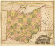 Through his hands-on work on the canal, Kelley became so well acquainted with the geography of Ohio that he authored the first comprehensive topographical map of the state in 1826. The other canal commissioners agreed to allow it to be published. Kelley tried to have the map published by a printer in the state of Delaware, but was embarrassed to discover that the Ohio General Assembly claimed copyright of his document.[91]