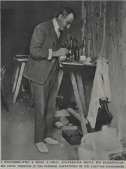 During his time in Egypt, Lucas developed an expertise in the analysis and preservation of objects recovered from excavated ancient Egyptian sites.[1] When in November 1922 the archaeologist Howard Carter discovered the tomb of Tutankhamun with its contents largely intact, the Egyptian authorities agreed to loan Lucas to the excavation.[7] He commenced work in December 1922,[8] a part of a small team of experienced archaeologists and experts, led by Howard Carter and including Arthur Mace, Arthur Callender and photographer Harry Burton.[9] Lucas played a key role in this team, being responsible for the conservation, restoration and preparation for shipping of the thousands of objects found, some of them quite fragile.[1] To enable him to undertake this work, a makeshift laboratory was set up in the nearby empty tomb of Seti II,[10] with Lucas, assisted by Arthur Mace, assessing, cleaning and – if necessary – repairing each object to ensure safe transport to the Cairo Museum.[11]