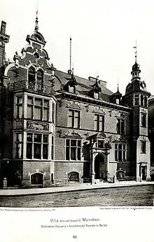 In 1889 Pringsheim and his family moved into a Neo-Renaissance villa at Arcisstrasse 12 designed by the Berlin architects Kayser & von Großheim with interior furnishings provided by Joh. Wachter and the court furniture manufacturer O. Fritsche of Munich. On major social nights the Munich elite was hosted here in what was known as the Pringsheim Palace. There he had the Romantic painter Hans Thoma, of similar political affiliation, decorate the music room.