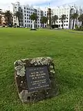To the north of the square is a plaque embedded into volcanic rock erected by the City of St Kilda to commemorate the site of the first recorded building in St Kilda which it states to be a "stockman's hut erected circa 1840 by Captain Benjamin Baxter". In 1842, the first Government plan of the village of St. Kilda showed a hut at the south west corner of the reserve.[1] This hut, the first recorded dwelling in St. Kilda, was likely to have been occupied by a stockman employed by George Thomas and John Enscoe, of the shipping agents, Thomas, Enscoe & James, who had a business at the corner of Flinders and Williams Street, Melbourne. The hut is likely to have been first built during Baxter's lease.[1]