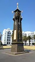 The memorial is built in brick covered by faience work. The supporting angles are formed to represent the trunks of gum-trees, branching out into leaves and cones under the main cornice, and the roots are shown on a bold projection above the base. Above the main cornice is a cross of a deep golden colour, which stands out clearly from the green tone of the general mass of work. One panel shows the names of the seven soldiers from St. Kilda who died. Two other panels record the names of the 58 who fought the Empire's battles and returned. On the fourth panel is the figure of a soldier, dressed in Australian khaki, and facing the sea. Above the main column is a wrought-iron pillar, supported by brackets, enriched with shields ; and under the golden cross rests a finely executed wreath on each panel.