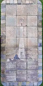 Through Nicholson and Wood, Wallis was introduced to Jim Ede who promoted his work in London. Despite this attention, Wallis sold few paintings and continued to live in poverty until he died in the Madron workhouse near Penzance. He is buried in Barnoon cemetery, overlooking St Ives Porthmeor beach and the Tate St Ives gallery. An elaborate gravestone, made from tiles by the potter Bernard Leach and depicting a tiny mariner at the foot of a huge lighthouse – a popular motif in Wallis's paintings – covers the tomb.