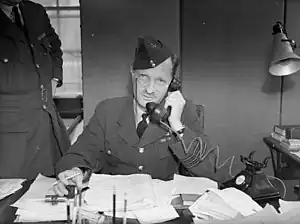 Promoted to temporary wing commander on 1 January 1940,[11] three months later Woodhall became commander of the Duxford station. He was also appointed the senior sector controller for No. 12 Group, responsible for directing RAF fighters to intercept incoming Luftwaffe bombing raids. His instructions were important in ensuring that the RAF fighters were optimally positioned to engage the Luftwaffe bombers and their escorts. A familiar and authoritative voice over the radio for fighter pilots taking off on interception duties, he became well known by the nickname 'Woody'.[1][12] A supporter of Squadron Leader Douglas Bader's Big Wing formation, in early November Woodhall was interviewed by Harold Balfour, the Under-Secretary of State for Air. Balfour's resulting memorandum was critical of Air Chief Marshal Hugh Dowding's leadership of Fighter Command during the Battle of Britain; Dowding considered moving Bader on, but the Chief of Air Staff, Charles Portal, specifically directed that he and Woodhall were not to be punished for expressing their views to Balfour.[13]