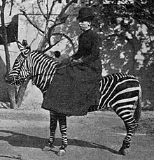Alice Hayes was a seasoned traveller, accompanying her husband on his many trips across the world.[2] She became skilled at breaking-in horses and, at her husband's demonstrations of horse training techniques, often rode the fiercest of horses that had been rejected as untrainable by tougher men.[1] In Calcutta, India, Hayes rode a mountain zebra that her husband had broken-in.[3] She recalled the animal as being a fierce kicker and sensitive to any touch on his ears. She noted that it was impossible to rein in because "he had a neck like a bull" and, though she admired the zebra's "seal-like" skin, regarded him as "too neck-strong to make a pleasant mount for a lady". She thought that she was the first woman to have ridden a mountain zebra.[4]