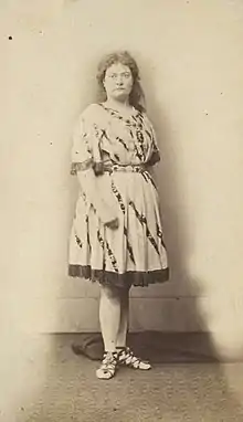 An alternative version of her life states that her stage debut was in December 1854 at the Old Drury.[27][14] She "served her novitiate" at the Adlephi Theatre, Liverpool, where her husband-to-be, "Bob" Edgar, was acting manager.[8] In December 1858 she performed in Pauline, or Three Murderers of De Burcy, and in Jane Brightwell, or The Beggar's Petition at the Royal Adelphi, Sheffield.[28][29]