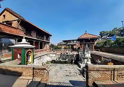 Alko Hiti can be found in a rectangular courtyard, a few steps down from street level,[5] where three sides are bounded by brick walls and the fourth, north-western side by a shelter, which is part pati (left, with one floor) and part sattal (right, with two floors), and the entrance to the courtyard.[6] In the eastern corner of the courtyard there is a Ganesha temple.[1]