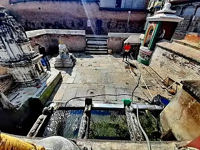 The five spouts of Alko Hiti give water from three different sources. The two makara spouts on the left are fed by an intake located at around 15 metres north-east of the basin. The makara spout on the right is the most productive. The Ganesha temple next to Alko Hiti is believed to have been built above the source to protect it. The two lower spouts are fed by an aquifer to the south of the hiti. The water is transported from the sources to the spouts through wooden underground channels (hitidun).[1]