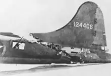 The fighter's wing collided with the top rear fuselage of the All American, almost cleaving the bomber's tail section off, leaving a large diagonal gash from the base of the All American's vertical stabilizer and severing the left horizontal stabilizer from the plane.[3] Metal in the airframe near the right tailplane was the only thing keeping the tail section, housing the rear gunner, attached to the aircraft.[3][7] The fighter broke apart, leaving some pieces in the bomber's fuselage.[7] Even though the control cables were severed, the crew was able to continue to fly the aircraft by using the autopilot system for the Norden bombsight, as it employed electric wires connecting to electric motor servos mounted next to the rudder and elevator.[8][9]