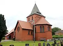 The church is constructed in red Ruabon brick The body of the church has a tiled roof, and the tower is roofed in Lakeland green slate.[2] Its plan consists of a four-bay nave and north aisle with a projecting baptistry at the west end, a south porch, north and south transepts, a short chancel with a polygonal apse, and a central tower.[2][5] The tower contains louvred bell openings and a corbel table. It is surmounted by a broach spire containing more louvred openings. The windows in the nave are triple lancets; those in the apse are double lancets, the east window having its base higher than the lateral windows. The windows in the aisle have either two or four lights.[2]