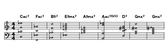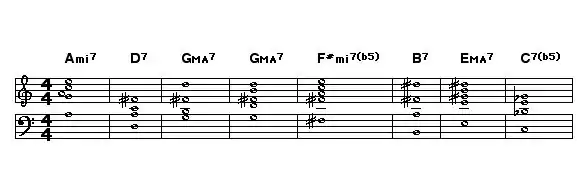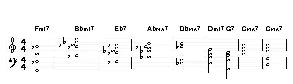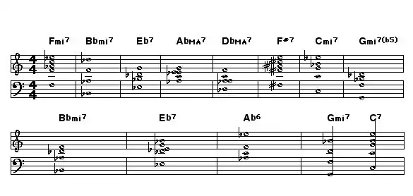 Note: The harmonic analysis demonstrates a functional chord progression using the circle of fifths. This type of progression generally relies on the roots of the chords being a 4th apart. Taking the main key of measures 1 to 5 as A-flat major, the chords can be considered as vi–ii–V–I–IV in A-flat major. (Fm7 is the sixth degree in A; Bm7 is second degree in A, etc.) Using a delay cycle, D being the tritone substitution for G7, the last 3 bars of the A section modulates to the key of C major temporarily.