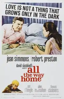 All the Way Home is a 1963 drama film directed by Alex Segal and starring Jean Simmons, Robert Preston, Pat Hingle, and Michael Kearney. The plot is about a young boy and his mother dealing with the sudden death of his father. It was based on the 1957 James Agee novel A Death in the Family[4] and the 1960 Tad Mosel play All the Way Home.[5]
