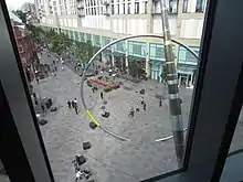 Alliance is a 25-metre-high (82 ft) sculpture in the centre of Cardiff, Wales, created by Paris installation artist Jean-Bernard Metais. It consists of a large, partly enamelled, stainless steel arrow, and a hoop that glows in the dark. It was financed by the St David’s shopping centre as part of a £1.5m public art scheme in the city centre, and was unveiled on 3 December 2009.[1]