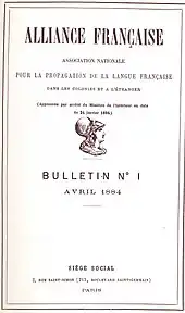 Alliance française[lower-alpha 1] (French pronunciation: [aljɑ̃s fʁɑ̃sɛːz]; "French Alliance") or AF is an international organization that aims to promote the French language and francophone culture around the world. Created in Paris on 21 July 1883 under the name Alliance française pour la propagation de la langue nationale dans les colonies et à l'étranger (French alliance for the propagation of the national language in the colonies and abroad), known now simply as L'Alliance française, its primary goal is teaching French as a second language. Headquartered in Paris,[1] the Alliance had 850 centers in 137 countries on every inhabited continent in 2014.[2]