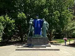 The Alma Mater, a bronze statue by sculptor Lorado Taft, is a beloved symbol of the University of Illinois Urbana-Champaign. The 10,000-pound statue depicts a mother-figure wearing academic robes and flanked by two attendant figures representing "Learning" and "Labor", after the university's motto "Learning and Labor."[1] Sited at the corner of Green and Wright Streets at the heart of the campus, the statue is an iconic figure for the university and a popular backdrop for student graduation photos.[2] It is appreciated for its romantic, heraldic overtones and warmth of pose. The statue was removed from its site at the entrance to the university for restoration in 2012 and was returned to its site in the spring of 2014.[1]