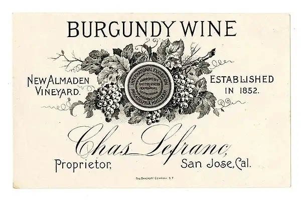 The winery was established by Éthienne Thée in 1852, who named the vineyard after New Almaden, a nearby quicksilver mining town.[2] Though sources contradict concerning details of the original foundation, it was undeniably Charles Le Franc, son-in-law of Thée, who planted the first choice European grape varieties at the foot of the Santa Cruz Mountains. The conditions of Pacific cool evening breeze and rocky soil are not sufficiently fertile for large yields but grapes of special quality.[2]