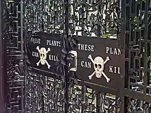 A garden featuring intoxicating and poisonous plants was added in February 2005. The garden was thought of by the duchess herself, who wanted the garden to have something that was different from other gardens. Species of the Poison Garden include Strychnos nux-vomica (source of strychnine), hemlock, Ricinus communis (source of harmless castor oil but also deadly ricin), foxglove, Atropa belladonna (commonly called Deadly Nightshade), Brugmansia and Laburnum.[4] The mission of the Poison Garden also includes drug education, with featured plantings of cannabis, coca and the opium poppy Papaver somniferum.[5] The Poison Garden is now one of the main reasons that people visit the gardens.