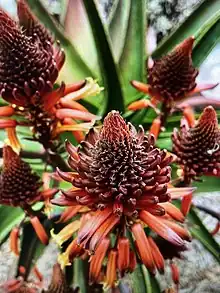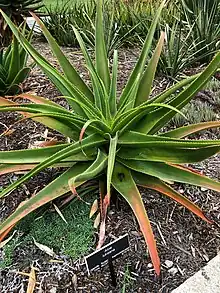 Aloe lukeana, or Luke's aloe, is a solitary species of aloe plant with a 3–5-foot tall (91–152 cm) stem topped by a 3–4-foot wide (91–122 cm) rosette with multiple (20 to 30) 2-foot long (61 cm) by up to 5-inch (13 cm) wide, recurving, and channeled dark green leaves with large evenly spaced light colored teeth. A. lukeana is native to Mount Morungole near the borders of South Sudan and Kenya in the Karamoja region of Uganda. The species was first formally described by Thomas Cole in 2015.[1] Named after and dedicated to Thomas Cole's brother Luke Cole who was killed in a traffic accident in Uganda in 2009.[2]