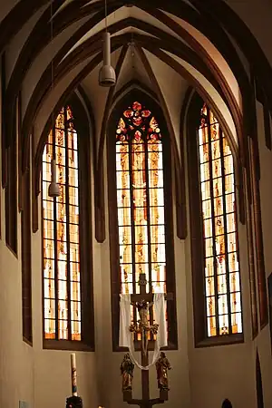 Alois Plum was born in 1935, the son of Josef Plum (d. 1988), who is mainly known for designing ecclesiastical paraments and especially robes and mitres. Josef Plum was also a painter and graphic artist, noted for his religious imagery. Alois Plum was trained at the Landeskunstschule in Mainz from 1951 to 1955, and spent a summer studying in Salzburg with Oskar Kokoschka. From 1955 to 1957 he studied with Georg Meistermann at the Kunstakademie Düsseldorf, and since 1957 has worked independently in Mainz.[2] His first work as a stained glass artist was executed in 1954, in the parish church in Niederrœdern. A notable early work was a mosaic of the Stations of the Cross in Steinheim.[3] Perhaps his largest work to date can be found in the Worms Cathedral, for which he designed, over three decades, a large number of stained glass windows; the earlier windows (dating to 1911) had been destroyed by allied bombing in 1943.[4]