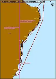Commander Alonso Vélez de Mendoza of the Order of Santiago was born in Moguer, Spain in the late 15th century. On June 6, 1499, he obtained a license from the Catholic Monarchs to sail to the Indies, which authorized him to take four caravels, although ultimately he only chartered two. They were supposed to head north to start the exploration of the coast of North America, or perhaps to enter into the competition of the Brazilian exploration.