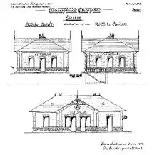 During the opening of the Glan Valley Railway, Altenglan station received a new entrance building and platforms were built between the line to Kusel and the line towards Lauterecken-Grumbach. The sandstone building was built in an architectural style that borrows from the great northern railways that were connected by the strategic railway. Nevertheless, its architecture was completely different from the other stations in the entire Palatinate. Thus, the symmetrically-constructed building has only one storey and the lines of the tops of its roof form a cross. A restaurant is now housed in it.[30][31]