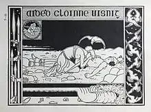 Gyles left Dublin for London in 1892, where she resumed studying art, firstly at Pedders, and then from 1893 at the Slade School of Fine Art. While in London she mixed with writers, including Oscar Wilde, who rated her work highly.[1] By 1896, Gyles had established a studio at 86, Charlotte Street, Fitzroy Square, and was a friend of the art critic Lady Colin Campbell and the artist Mabel Dearmer. Gyles's poem Dew-time was published in the Pall Mall Magazine in October 1894. She also illustrated the poem, which was influenced by George Russell. In June 1896, her drawing The Offering of Pan appeared in The Commonweal, and in 1897 she illustrated T. W. Rolleston's Deirdre: the Feis Ceoil Prize Cantata. Around this time she and Yeats became interested in the Hermetic Order of the Golden Dawn, the cabbalistic iconography of which influenced her design of the cover of Yeats's book The Secret Rose (1897).[4] She also designed the cover of his Poems (1899) and The Wind among the Reeds (1899) and created a cover design for Matthew Russell's The Idylls of Killowen (1898).[1]