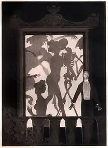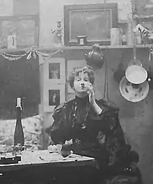 Both Yeats and Gyles were acquaintances of Aleister Crowley, with whom Gyles had a romantic affair.[6] Their experiences with magic and astral vision are chronicled by Crowley as his fictional characters, with Crowley as Count Swanoff, Gyles as Hypatia Gay, and Yeats as Will Bute. In 1899, Gyles illustrated Wilde's The Harlot's House, which was published by Leonard Smithers. Gyles became involved with Smithers, which eventually caused Yeats to distance himself from her. Later in 1899, she designed the covers for Ernest Dowson's Decorations, which featured a stylised rose that Yeats described as her "central symbol." For the top board of The Night (1900), by John White-Rodyng, she pictured four swirling birds pecking at a heart between a sun and a moon, with stars. By mid-September 1900, Arthur Symons discovered her in an empty room at 15, Granby Place, Hampstead Road, "without a thing in the place, except five books (one a presentation copy from Oscar Wilde) and one or two fantastic gold ornaments which she used to wear; chloral by her side, and the bed strewn with MSS." Gyles had left her library with Yeats, to save it from the bailiffs. Symons sold Gyles's poem For a Sepulchre to the Saturday Review. She was recovering in the Royal Hospital for Diseases of the Chest, in the City Road, when Smithers went bankrupt. In November 1900 she offered Smithers £6 towards Wilde's funeral, which he refused.[4]