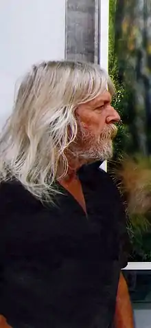 ![]() Alvin Pankhurst in front of his painting Tuturu Aotearoa | |