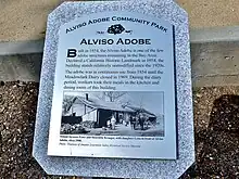 The Alviso Adobe Community Park is a 7-acre (2.8 ha) park in the city of Pleasanton, California, United States. It is built around an adobe house constructed in 1854 by Francisco Alviso on the Rancho Santa Rita Mexican Land Grant.[2] The Alviso Adobe is a rare surviving example of an early American adobe that was continuously in use until 1969. The building is registered as California Historical Landmark #510 in 1954,[1] but most of the historical marker was later found to be erroneous.[2][3]