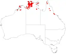 In Western Australia it is found in the IBRA regions of Central Kimberley, Dampierland, and Northern Kimberley,[5] while in the Northern Territory it is found in the IBRA regions of Arnhem Coast, Arnhem Plateau, Cape York Peninsula, Central Arnhem, Daly Basin, Darwin Coastal, Gulf Fall and Uplands, Northern Kimberley, Ord Victoria Plain, Pine Creek, Tiwi Cobourg, and Victoria Bonaparte.[1]