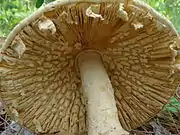 The gills are free from attachment to the stem, crowded together, moderately broad, and yellowish-white to pale yellow. Interspersed among the gills are short gills (lamellulae) that do not extend completely to the stem; they are somewhat truncated (abruptly terminated) to attenuated (tapering gradually).