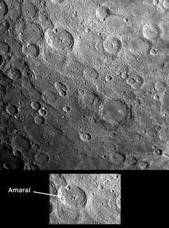 Amaral is the second-largest crater of the Kuiperian system on Mercury, at 105 km diameter, after Bartók at 118 km. It is followed by Tyagaraja crater.[2]