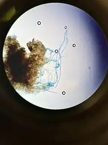 Only one Ambrosiella (A. cleistominuta from the xyleborine ambrosia beetle Anisandrus maiche) has ever been reported to produce sexual structures, and the rest (including A. roeperi) have been assumed to undergo exclusively clonal reproduction.[11] All Ambrosiella produce translucent, flask-shaped conidiogenous cells (phialides) borne on non-fertile sporodochia (minute, dense cushions of nonreproductive hyphae holding up the fertile tissue). Conidia may arise from these phialides as chains - i.e., new spores are successively pushed out, with the newest growth closest to the original conidiogenous cell - or singly, as an aleurioconidium that ruptures the membrane of the mother cell and then remains a unique, differentiated terminal unit without any subsequent neighbors produced from the phialide.[7][10] A. roeperi operates only through the latter mechanism, which is distinct from what is reported in A. beaveri , A. trypodendri, and A. hartigii (suggested to use the former, chain-like method).[2]