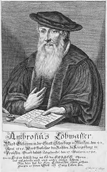 Ambrosius Lobwasser (1515–1585) was a German humanist and translator, born in Saxony. He served as professor of jurisprudence at the University of Königsberg from 1563 until his retirement in 1580, but is best known for his Psalter des Königlichen Propheten David, published in 1573 (Leipzig). This metrical psalter, a translation of the Genevan Psalter, became one of the standard psalm-books used by the evangelical churches of the German-speaking lands, including Switzerland (the Genevan Psalter had been written in French). The Lobwasser psalter was widely reprinted into the 1800s.[1]
