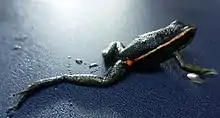 The Amarakaeri poison frog is a medium-sized dart frog with a black unmarked dorsum, and an orange dorsolateral stripe running from the tip of the snout to the groin where it turns into a bright orange blotch that extends slightly to the anterior surface of the thigh. Under the eye the frog has a whitish-bronze labial stripe which extends under the tympanum to the base of the upper arm. The legs are brown with faint dark mottling. All ventral surfaces are a bright blue against a bold black reticulated pattern. The blue pattern fades to a pale grey or bronze color on the lateral sides of the frog before fading away entirely. Their iris is black with copper flecks.[3] The eggs are covered in a transparent orange mucilage.