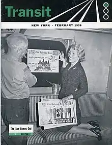 ![]() Amelia Opdyke Jones with an example of her work on The Subway Sun, 1956 | |