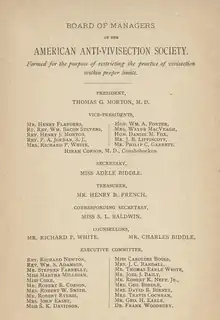 - 1 2 Santoro, Lily. "History of the American Anti-Vivisection Society". Archived from the original on 2012-04-14. Retrieved 2008-11-25.