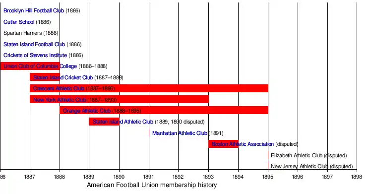 The Crescent Athletic Club was officially admitted to the AFU as a full member in April of the 1887 season.[21] They would become the most dominant team in the Union over the next five seasons. A team was also formed by the Staten Island Cricket and Baseball Club,[22] after spending a year consolidated in the Staten Island Football Club (and any players that were in the football club were then amalgamated in the cricket club).[23][24] The last addition for the season was the New York Athletic Club, which entered the league to replace the Crickets of Stevens, who may have combined with the Unions of Columbia in mid-October.[25][26] The Unions would last for a month before folding themselves, with some sources claiming that the team did so because of their abysmal league record.[27] At a meeting on November 21, the AFU officially recognized the Crickets resignation from the league, but stated that the Unions of Columbia College's resignation was still "laid out on the table".[28]